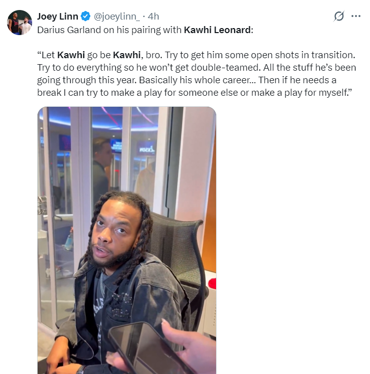 赛后加兰谈到伦纳德:我们就是让科怀做自己,试着在攻防转换时给他创造一些空位投篮的机会避免让他遭遇双人包夹。今年他一直都遭遇多人包夹,我们还需要给他休息的机会,我会试着给其他人创造一些机会,自己持球也能打打。