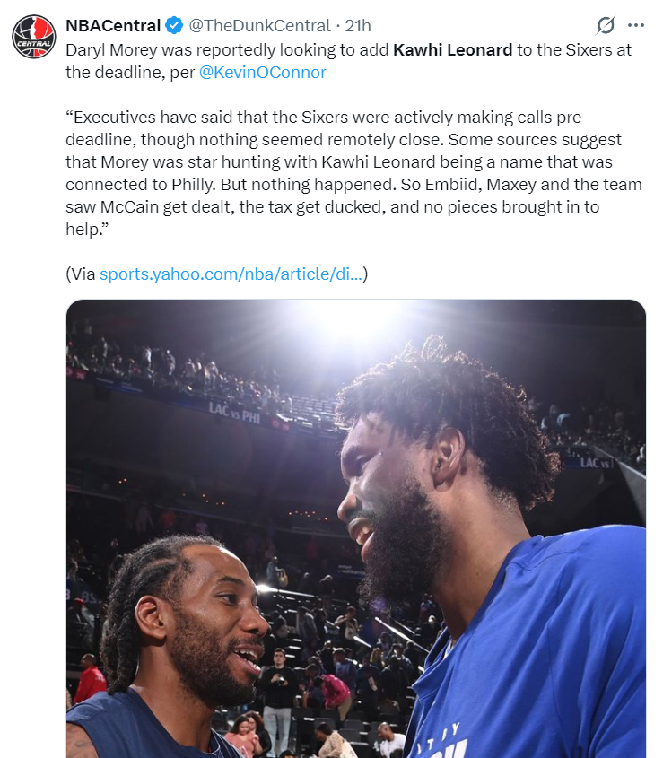 根据凯文-奥康纳的消息,费城在交易截止日前曾试图引进伦纳德,只可惜最终快船并没有交易伦纳德的打算。