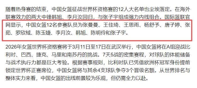 女篮国家队12人名单正式出炉,仅4名老将坐镇,大批新人强势补位,备战势头拉满。