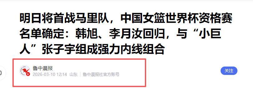 鲁中晨报2026-03-10《明日将首战马里队,中国女篮世界杯资格赛名单确定:韩旭、李月汝回归,与“小巨人”张子宇组成强力内线组合》